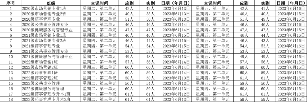 为全面推进本科教育水平评估工作,pp电子游戏平台官网党委积极组织学生党员开展查课工作,于6月18日,对第十五周的查课情况做出总结。本周查课以严谨认真的态度对迟到、旷课、带早餐的学生进行了督促和教育。学生党员进入每间教室内检查学生出勤情况。经过一周的督查,学院共查18个班级36节课,覆盖学院全体20级、21级、22级及22级专升本共952名学生。现查课通报如下: