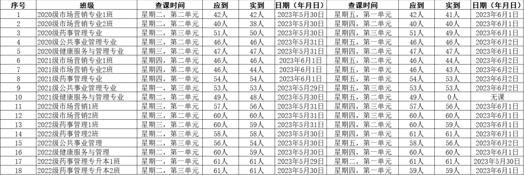 为全面推进本科教育水平评估工作,pp电子游戏平台官网党委积极组织学生党员开展查课工作,于6月3日,对第十三周的查课情况做出总结。本周查课以严谨认真的态度对迟到、旷课、带早餐的学生进行了督促和教育。学生党员进入每间教室内检查学生出勤情况。经过一周的督查,学院共查18个班级36节课,覆盖学院全体20级、21级、22级及22级专升本共952名学生。现查课通报如下:
