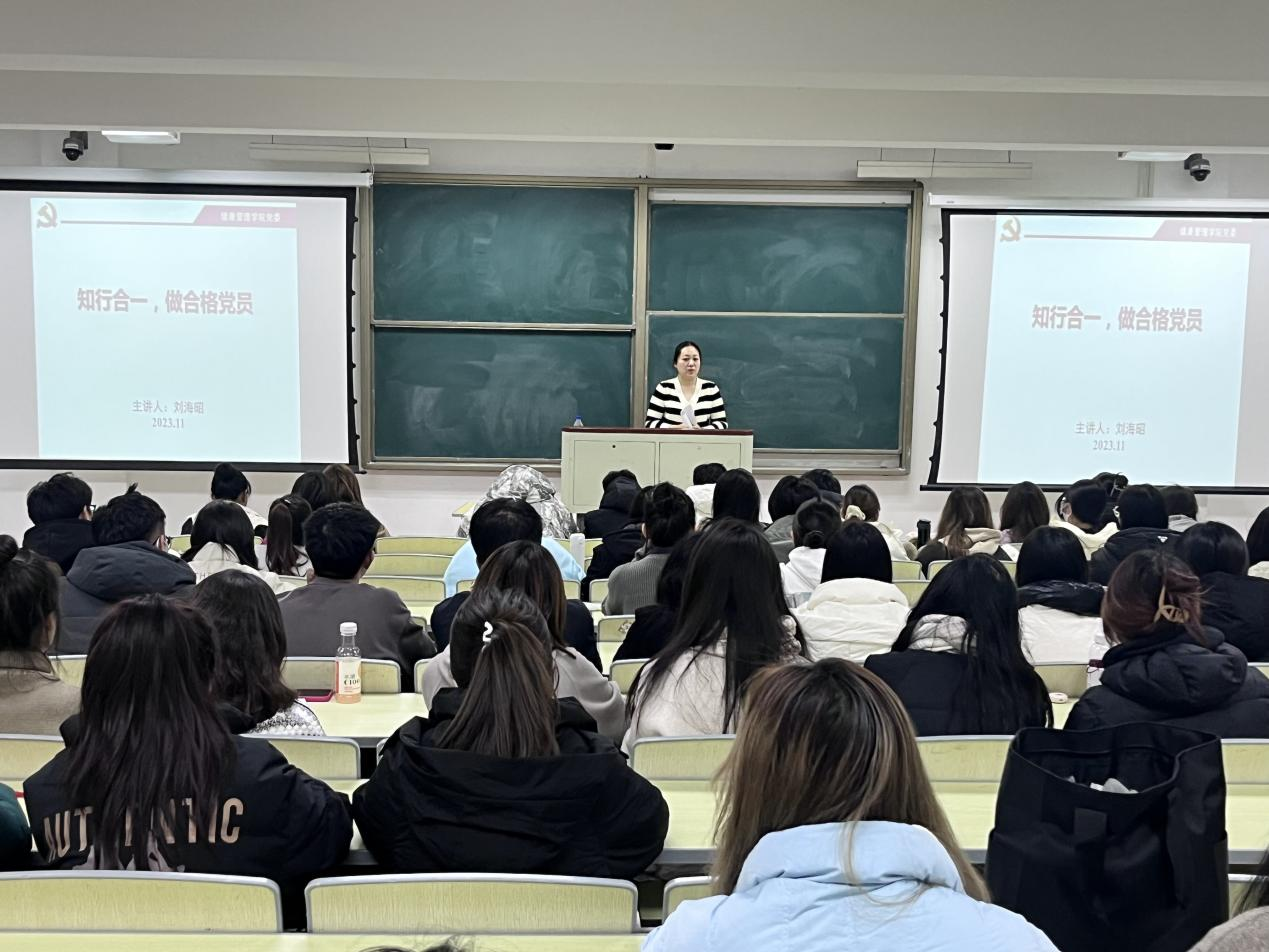 2023年11月8日,pp电子游戏平台官网党校第九期学生入党积极分子培训班在致知楼1422教室开展第六讲,邀请到pp电子游戏平台官网党委组织员刘海昭做题为《知行合一,做合格党员》专题党课。
