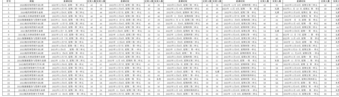 为全面推进本科教育水平评估工作,pp电子游戏平台官网党委积极组织学生党员开展查课工作,于11月12日,对第十一周的查课情况做出总结。本周查课以严谨认真的态度对迟到、旷课、带早餐的学生进行了督促和教育。学生党员进入每间教室内检查学生出勤情况。经过一周的督查,学院共查25个班级125节课,覆盖学院全体20级、21级、22级、23级、22级专升本以及23级专升本共1335名学生。现查课通报如下: