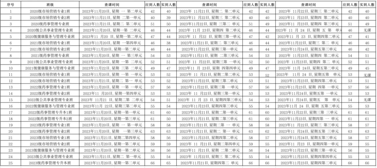 为全面推进本科教育水平评估工作,pp电子游戏平台官网党委积极组织学生党员开展查课工作,于11月26日,对第十三周的查课情况做出总结。本周查课以严谨认真的态度对迟到、旷课、带早餐的学生进行了督促和教育。学生党员进入每间教室内检查学生出勤情况。经过一周的督查,学院共查25个班级75节课,覆盖学院全体20级、21级、22级、23级、22级专升本以及23级专升本共1335名学生。现查课通报如下: