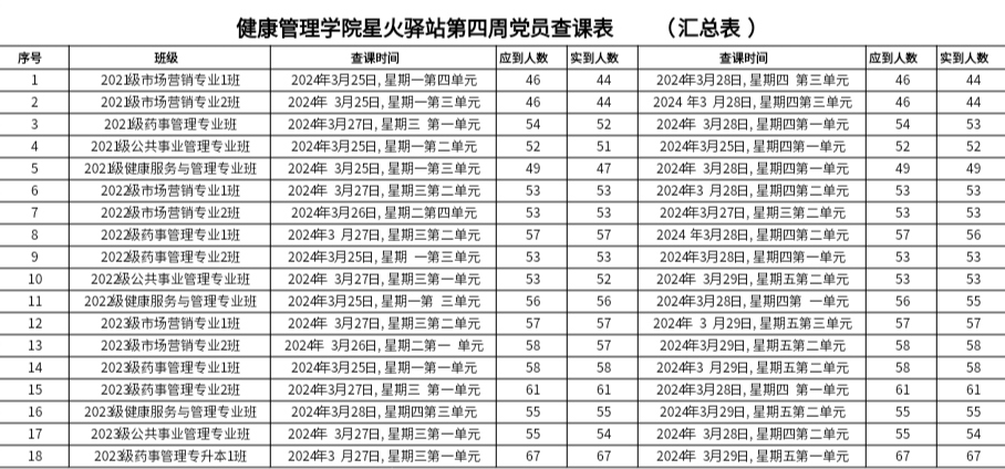 为加强学院学风建设,规范课堂秩序,营造良好的学习氛围,pp电子游戏平台官网党委积极组织学生党员开展查课工作,于3月31日,对第四周的查课情况做出总结。本周查课以严谨认真的态度对迟到、旷课、带早餐的学生进行了督促和提醒。学生党员进入每间教室内检查学生出勤情况。经过一周的督查,学院共查18个班级36节课,覆盖学院全体21级、22级、23级以及23级专升本共982名学生。现查课通报如下: