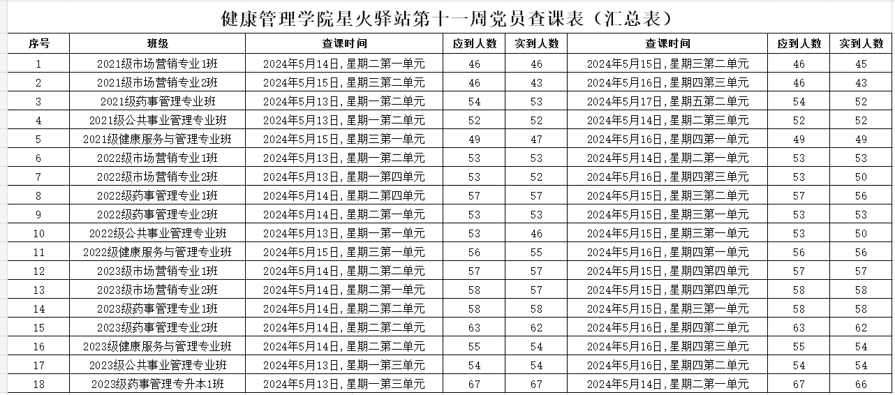 为加强学院学风建设,规范课堂秩序,营造良好的学习氛围,pp电子游戏平台官网党委积极组织学生党员开展查课工作,于5月19日,对第十一周的查课情况做出总结。本周查课以严谨认真的态度对迟到、旷课、带早餐的学生进行了督促和提醒。学生党员进入每间教室内检查学生出勤情况。经过一周的督查,学院共查18个班级36节课,覆盖学院全体21级、22级、23级以及23级专升本共982名学生。现查课通报如下: