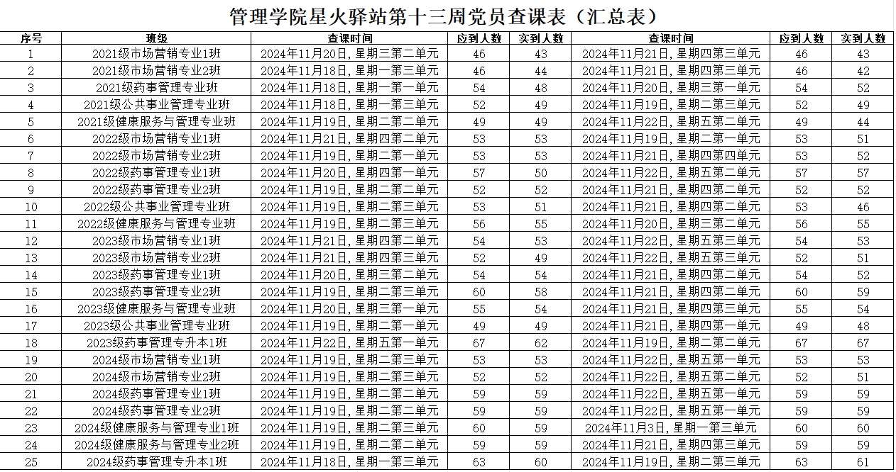 据本周查课结果显示,有部分班级出勤率不能达到100%。希望各班级见贤思齐,力争上游,高度重视课堂出勤,坚决抵制迟到、旷课现象,加强班级学风建设,形成良好的学习氛围。同时,管理学院学生党员将会加大查课力度,更好地为全院师生服务。