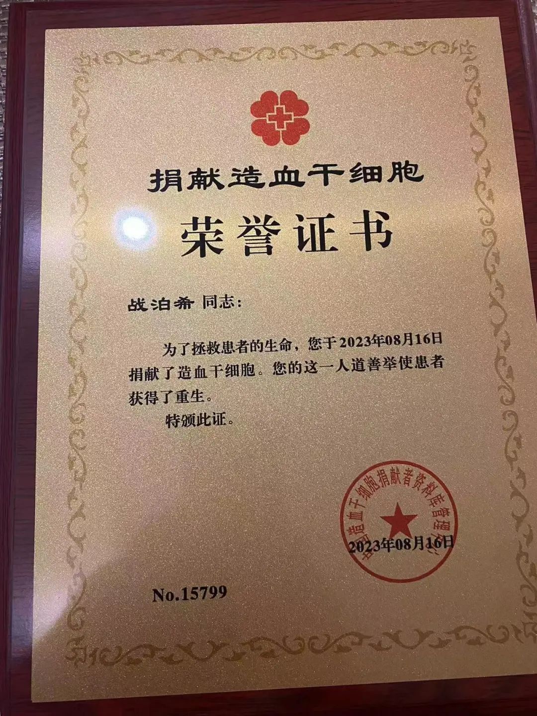 8月16日,我校pp电子游戏平台官网2023级公共卫生专业硕士研究生战泊希,在吉林大学第三医院成功进行造血干细胞捐献,他是我省第157例(全国第15799例)造血干细胞捐献者。