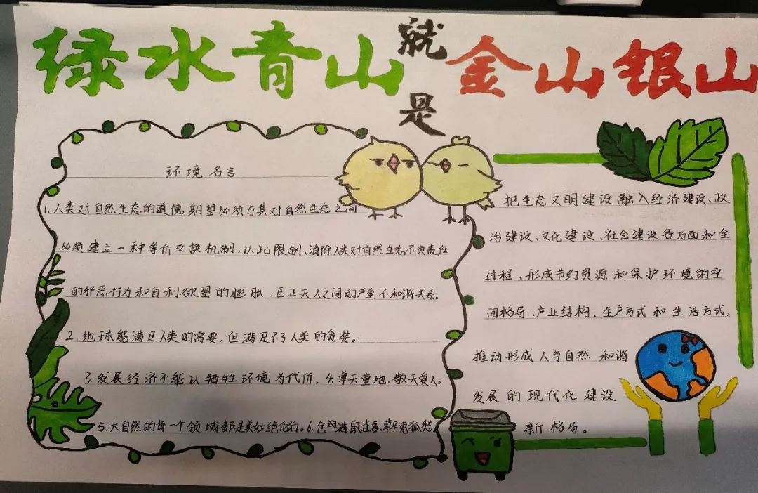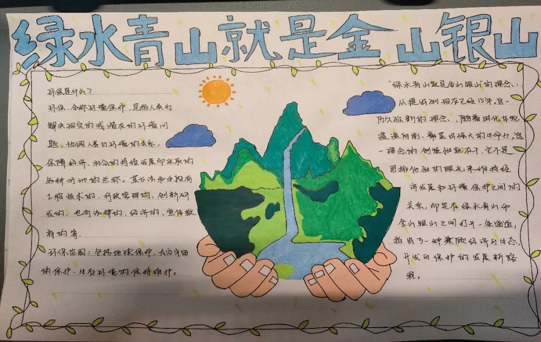“绿水青山就是金山银山”阐述了经济发展和生态环境保护的关系。这一理念强调保护生态环境就是保护生产力、改善生态环境就是发展生产力,指明了实现发展和保护协同共生的新路径。为此,pp电子游戏平台官网开展“绿水青山就是金山银山”主题手抄报活动。